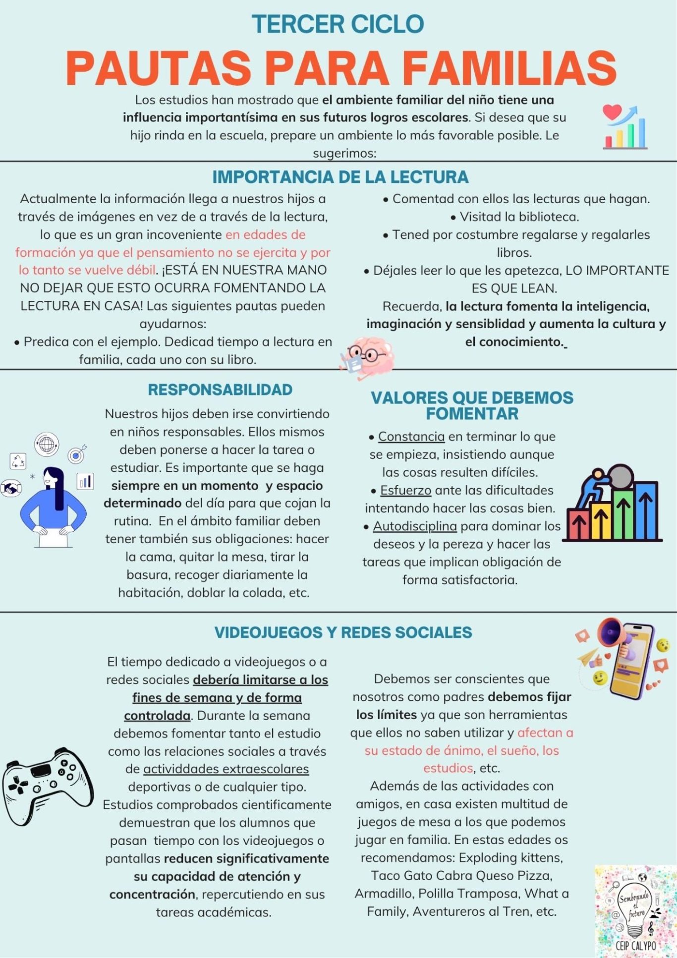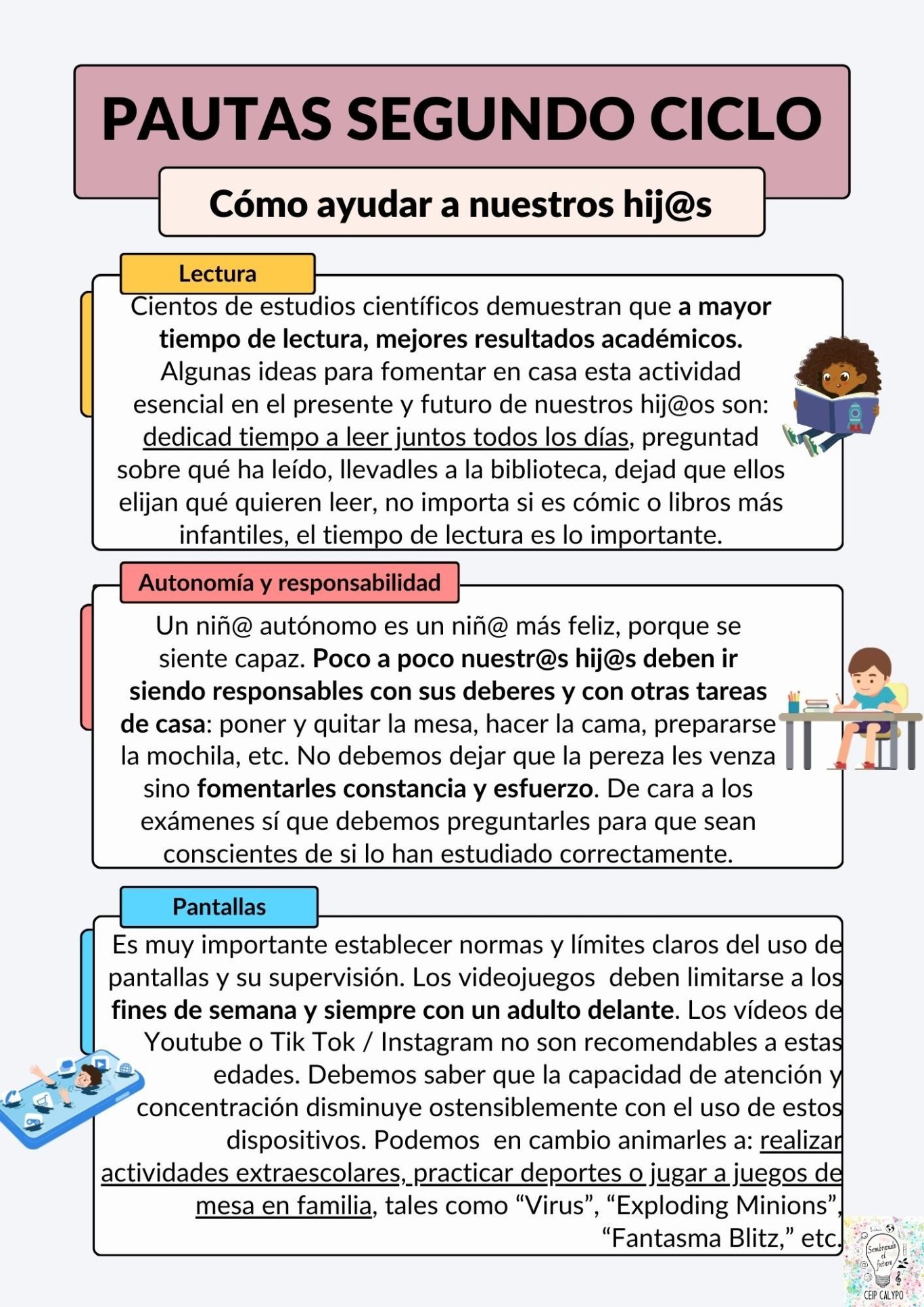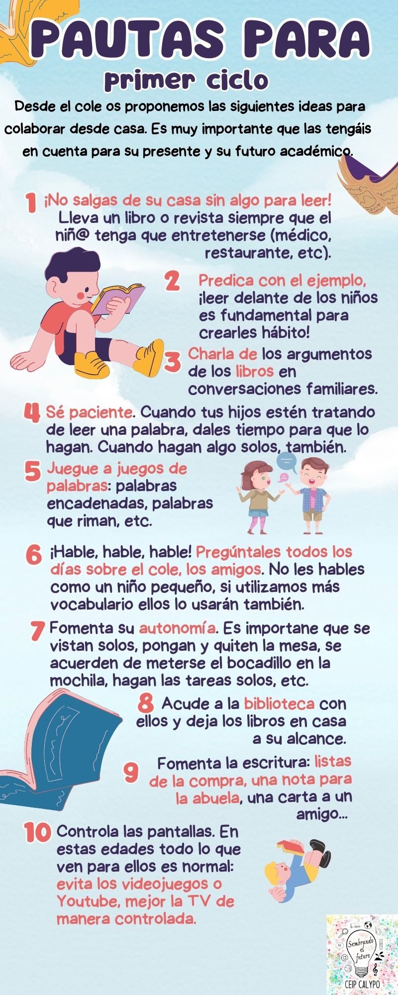 Desde el CEIP Calypo, queremos garantizar un adecuado desarrollo de las estrategias lectoras de nuestro alumnado y fomentar el gusto por la lectura. Se trata de una tarea que incumbe a todo el profesorado y que requiere la colaboración de familias y de otras instituciones. El Plan de Lectura constituye un instrumento dinámico que incorpora todas las actividades que se desarrollan para lograr este objetivo. Permite una planificación rigurosa y sistemática de la enseñanza de la lectura, a la vez que incluye las actuaciones precisas para el impulso del hábito lector de los alumnos y alumnas.